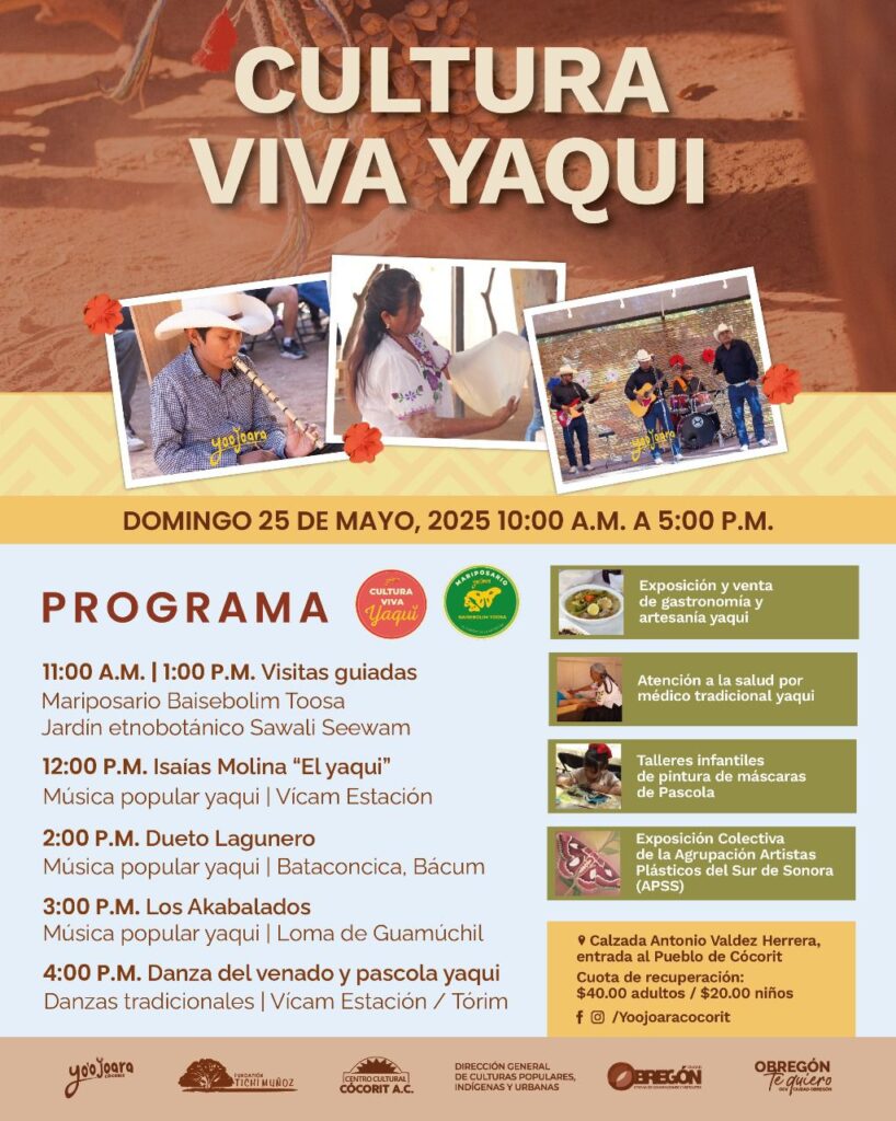 Cócorit, Sonora; a 21 de mayo de 2025.- El domingo 25 de mayo se realizará el Evento de Cultura Viva Yaqui en el espacio Yo´o Joara, ubicado en la entrada al pueblo de Cócorit.