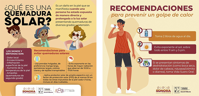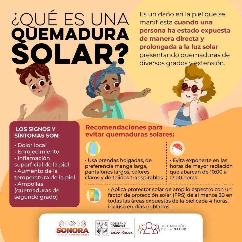 Hermosillo, Sonora; 30 de junio de 2025.- La exposición extrema al sol puede llegar a ser mortal, por ello, el Gobierno de Sonora, a través de la Secretaría de Salud (SSP), exhortó a la población a cuidarse durante esta temporada de calor y, en caso de presentar signos de golpe de calor, deshidratación o quemaduras solares, acudir de inmediato a su unidad de salud más cercana.