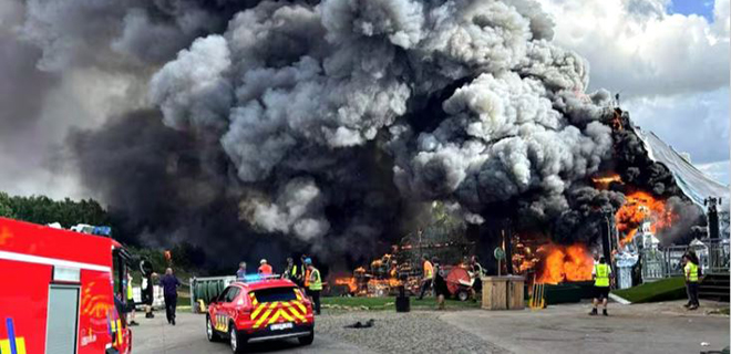 Arriba de las llamas, el humo inundó el aire, mientras los trabajadores se alejaban de la escena ante el peligro. La temática de este año es “Orbyz, descubre la comunidad oculta”, y se llevará a cabo desde el 18 al 20 de julio y del 25 al 27 de julio de 2025.