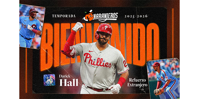 Hermosillo, Sonora; ago. 13 de 2025 (Prensa Naranjeros).- Darick Hall es un Primera Base y Bateador Designado zurdo nacido en Hereford, Arizona que participó en par de temporadas en Ligas Mayores con los Phillies de Philadelphia.