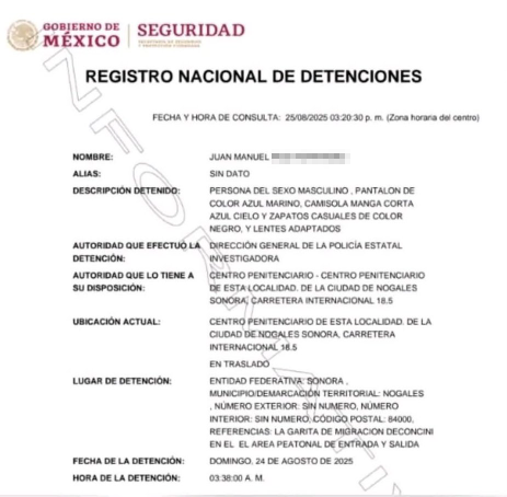 Según el Registro Nacional de Detenciones, Juan Manuel ‘N’ fue detenido a las 03:38 horas del domingo 24 de agosto en la Garita de Migración Deconcinni, en el área peatonal de entrada y salida, en Nogales.