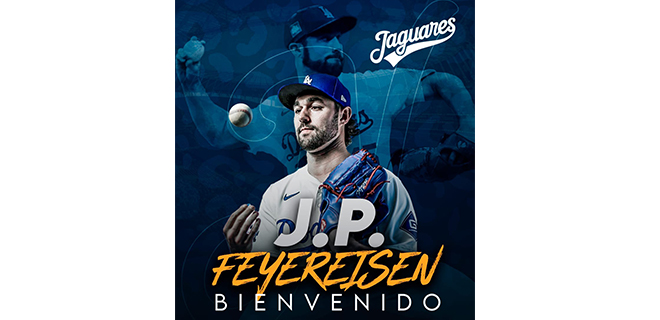 Tepic, Nayarit; Agosto 19 de 2025 (Prensa Jaguares). – El lanzador derecho que lanzó este año para los Dbacks de Arizona y Dodgers de Los Ángeles, J.P Feyereisen, se convierte en el cuarto refuerzo de los Jaguares para la temporada 2025-26 de la Liga ARCOMexicana del Pacífico.