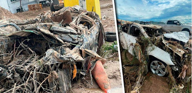 Hermosillo, Sonora; septiembre 3 de 2025.- Dos vehículos fueron arrastrados por las fuertes aguas que generaron las lluvias ocurridas en la madrugada de este miércoles 3 de septiembre, al norte de Hermosillo.