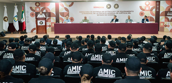 – Elementos de la Fiscalía General de Justicia del Estado (FGJE) fueron beneficiados por el gobernador Alfonso Durazo con la entrega de estímulos económicos que suman en total más de un millón de pesos, unidades, vehículos forenses, uniformes, equipo fotográfico, armamento y municiones.