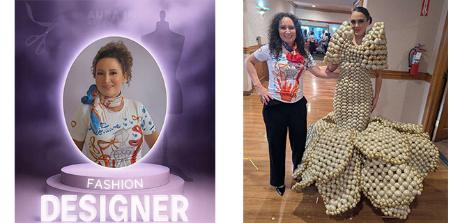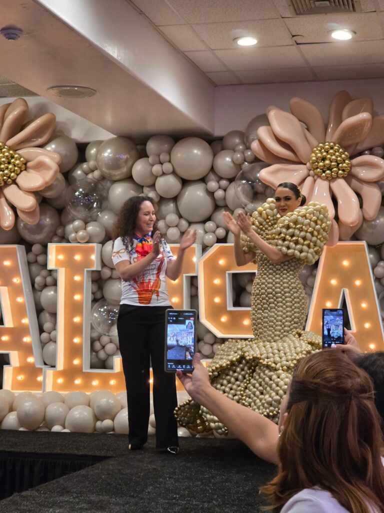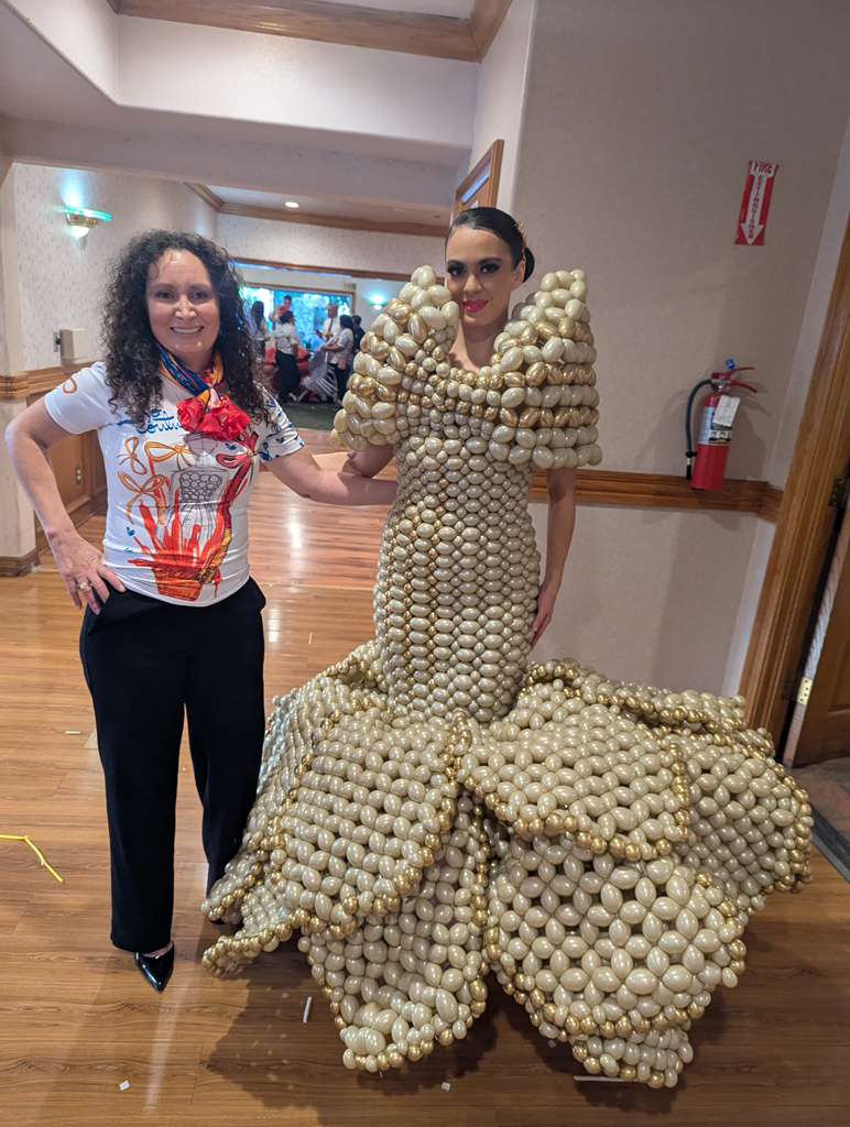 Durante la presentación, Nadia representó con elegancia y talento el arte de la confección de vestidos hechos con globos, fusionando creatividad, técnica y pasión en cada detalle.