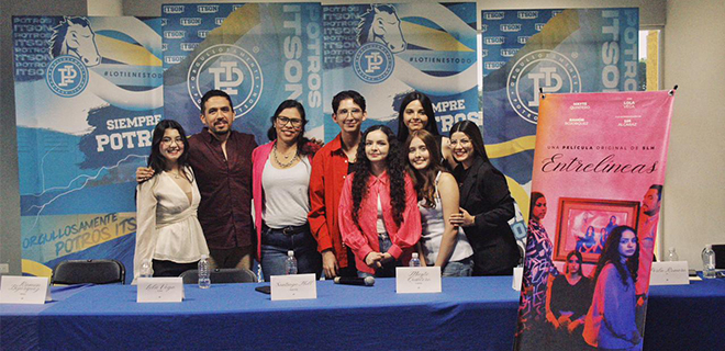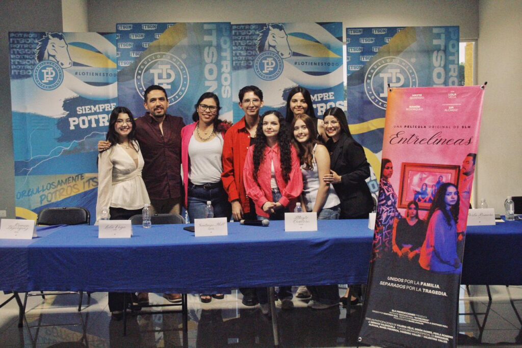 Navojoa, Sonora; 21 de octubre de 2025.- El Instituto Tecnológico de Sonora (ITSON), Unidad Navojoa, fue sede este martes 21 de octubre de la rueda de prensa del largometraje “Entrelíneas”, realizada a las 11:30 a.m. en el Lobby del Edificio de Extensión a la Cultura y el Deporte.