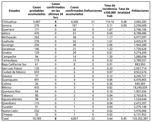 Con 101 contagios confirmados, Sonora se ubica como el segundo estado con más casos a nivel nacional, solo detrás de Chihuahua, donde se originó el brote y se concentran 4 mil 364 personas infectadas.