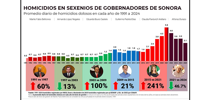 -Durante la actual administración, el promedio diario de homicidios dolosos en Sonora disminuyó 46.7%, la mejor cifra en décadas, marcando un punto de quiebre frente a los incrementos históricos registrados en sexenios anteriores.