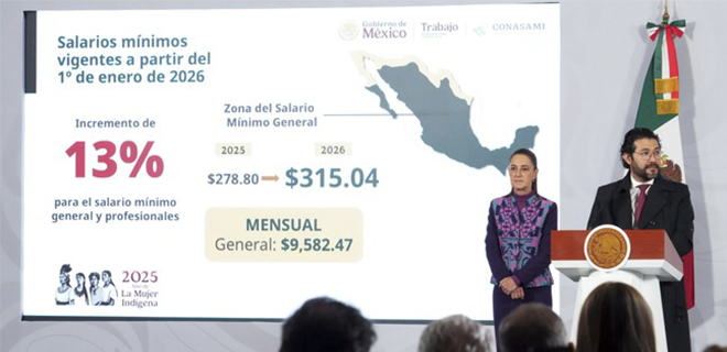 El gobierno federal, el sector empresarial y las organizaciones de trabajadores alcanzaron un acuerdo unánime para incrementar en 13% el salario mínimo general a partir del 1 de enero de 2026, con lo que pasará de 278.80 a 315.04 pesos diarios a nivel general.
