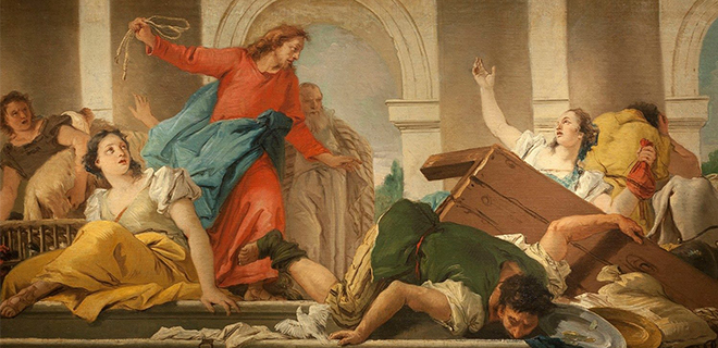 Según el relato bíblico, tras su llegada a Jerusalén, Jesús ingresó al templo y se encontró con un ambiente dominado por el comercio y la corrupción. Al ver el templo convertido en un mercado, volcó las mesas de los cambistas y denunció la transformación del lugar sagrado con una declaración contundente: “Mi casa será llamada casa de oración, pero ustedes la han convertido en una cueva de ladrones.” (Mateo 21:13).