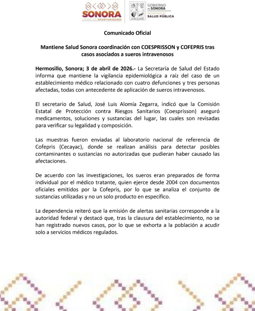 Hermosillo, Sonora, 3 de abril de 2026.- Como parte del avance en las investigaciones relacionadas con el fallecimiento de cuatro personas a quienes un médico tratante de Hermosillo les suministró o prescribió soluciones parenterales (sueros), la Fiscalía General de Justicia del Estado de Sonora (FGJES), informa que las sustancias, medicamentos e insumos asegurados durante la investigación ya fueron recibidos ayer en la Ciudad de México a las 21:40 horas por la Comisión de Control Analítico y Ampliación de Cobertura (CCAYAC), organismo que funge como laboratorio nacional de referencia, de la Comisión Federal para la Protección contra Riesgos Sanitarios (COFEPRIS), a fin de que se lleven a cabo los análisis especializados correspondientes.