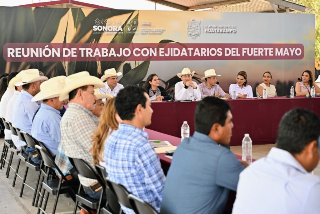 Huatabampo, Sonora; 3 de abril de 2026.– Con el objetivo de dar respuesta a la demanda del recurso hídrico por parte de productores del sur del estado, el gobernador Alfonso Durazo Montaño encabezó una reunión con ejidatarios del Fuerte Mayo en la que se dio puntual seguimiento a la situación de los ejidos para garantizar la correcta distribución de agua de la presa Luis Donaldo Colosio (Huites).