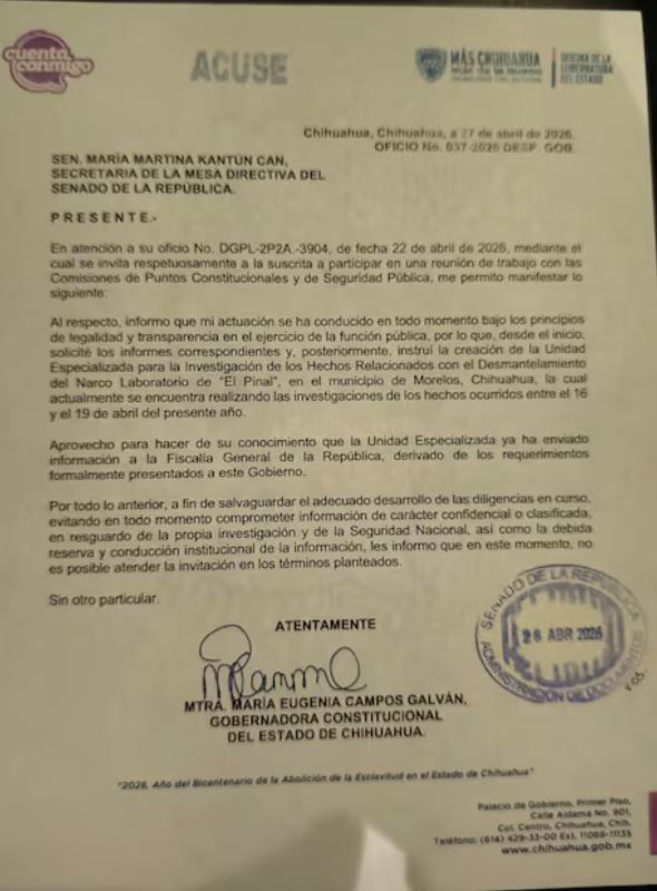 Abril 28 de 2026.- La gobernadora de Chihuahua, Maru Campos, informó al Senado que para salvaguardar las diligencias de la investigación en torno al caso del narco laboratorio desmantelado, no acudirá al Senado, donde se esperaba su presencia este martes.